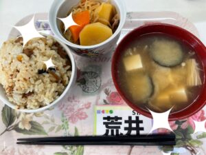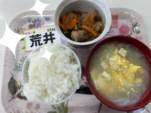今日の給食は、ご飯、味噌汁、筑前煮でした!
